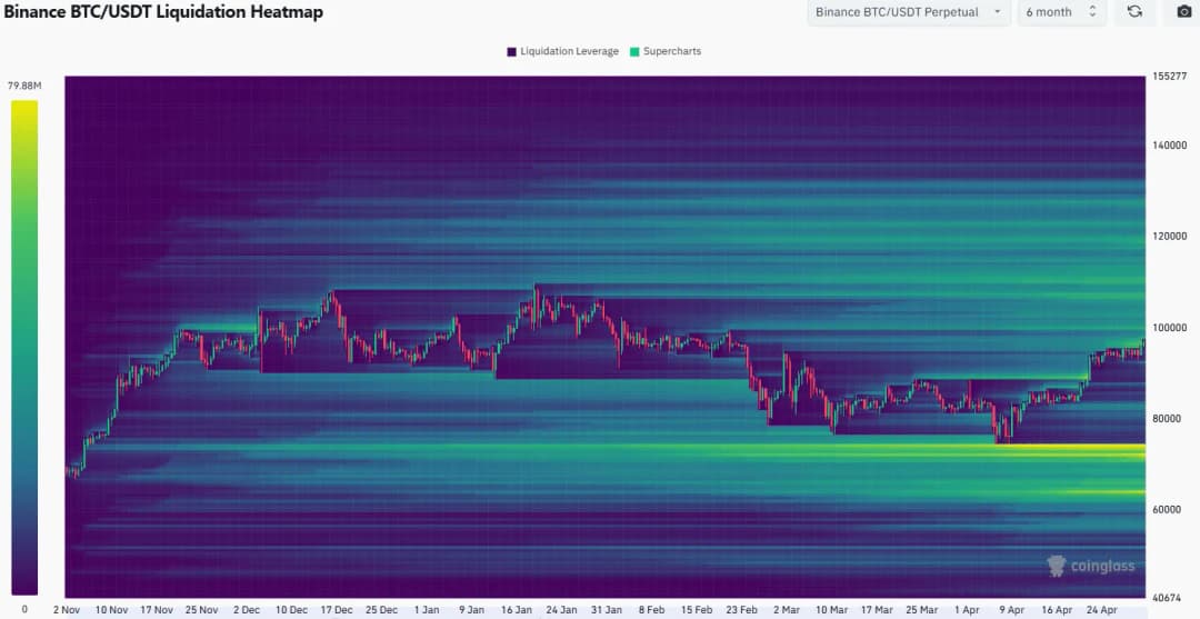 نقشه حرارتی لیکوئیدیتی شش ماهه نشان داد جیب های لیکوئیدیتی جنوب بازار کم تعدادند؛ سطوح اصلی ۸۳ و ۷۴.۱ هزار دلار بودند که فاصله زیادی با قیمت داشتند. در شمال نیز ۱۰۰، ۱۰۶.۸ و ۱۱۰.۲ هزار دلار به عنوان مناطق مغناطیسی بعدی ظاهر شدند. در زمان نگارش، کلاستر لیکوئیدیتی ۹۶.۶ هزار دلار هنگام شکست خروج از محدوده کوتاه مدت پاکسازی شده بود.