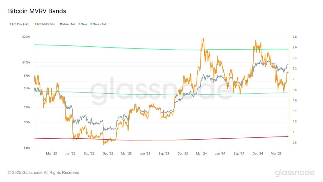 باند MVRV پس از آزمون ۸ آوریل از سطح ۱.۷۴ جهش کرد و تا ۲.۱۴ در زمان نگارش رسید. این موضوع نشان می دهد بیت کوین یک اصلاح دیگر را پشت سر گذاشته و دوباره شرایط صعودی به خود گرفته است.