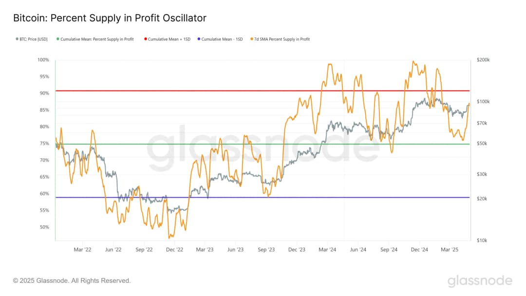 اسیلاتور درصد عرضه در سود نیز از میانگین بلندمدت ۷۴.۸ درصد بازگشت داشت. این معیار نشان می دهد چه درصدی از سکه ها در سود یا زیان نسبت به بهای تمام شده هستند. جهش دو هفته اخیر روند اوت سپتامبر ۲۰۲۴ را تکرار کرد. در زمان نگارش، میانگین متحرک هفت روزه این معیار ۸۷ درصد بود که نشانه انتظارات صعودی سرمایه گذاران است.