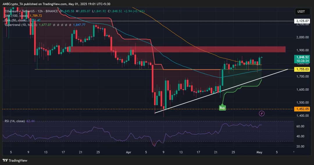 در نمودار قیمتی ۱۲ ساعته، ETH در یک روند صعودی بهنظر میرسد.