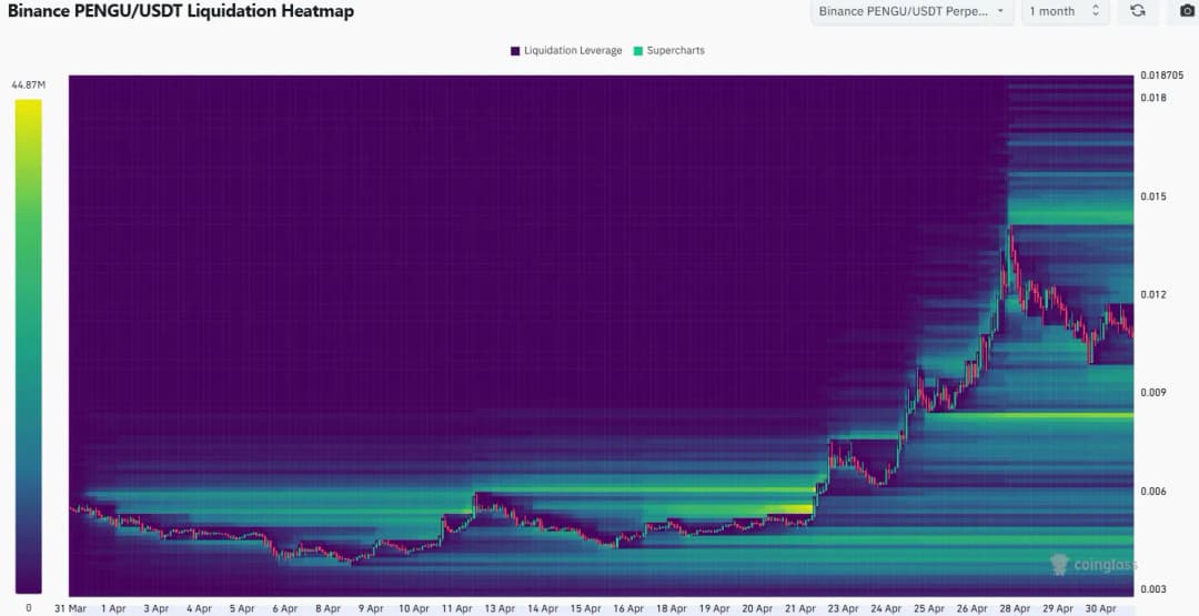 نقشه گرمایی لیکوئیدیتی یکماهه نشان میدهد تجمع سفارشهای لیکوئید در سطوح ۰.۰۱۲ و ۰.۰۰۹۶۶ دلار وجود دارد. سطح ۰.۰۰۸۳ دلار نیز میتواند بهعنوان یک منطقه مغناطیسی جذاب عمل کند و همراستا با بازگشتی ۶۱.۸٪ است. شواهد نشان میدهد PENGU ممکن است قبل از از سرگیری روند صعودی، افت بیشتری تا حوالی این ناحیه تجربه کند. با توجه به سرمایه بازار نسبتاً کوچک این توکن، نوسان طبیعی است. اگر قیمت در ۰.۰۰۸۳ دلار واکنش صعودی نشان دهد، خریداران میتوانند هدفهای ۰.۰۱۴۲ تا ۰.۰۱۵۱ دلار را دنبال کنند.