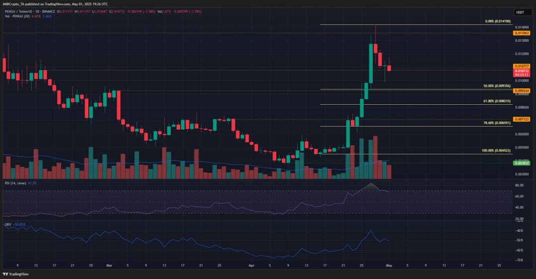 نمودار یکروزه نشان داد توکن PENGU در نیمه دوم آوریل مقاومتهای محلی (نارنجی) را شکست. حجم معاملات افزایش یافت و صعود را تأیید کرد. پس از رسیدن قیمت به ۰.۰۱۴۱ دلار، خریداران با مقاومت مواجه شدند. سطوح بازگشتی فیبوناچی نشان داد قیمت میتواند بیشتر کاهش یابد؛ بهویژه سطوح ۶۱.۸٪ و ۷۸.۶٪ در ۰.۰۰۸۲ و ۰.۰۰۶۶ دلار که بهعنوان حمایتهای کلیدی عمل میکنند و در صورت بازگشت، فرصت خرید مناسبی خواهند بود.