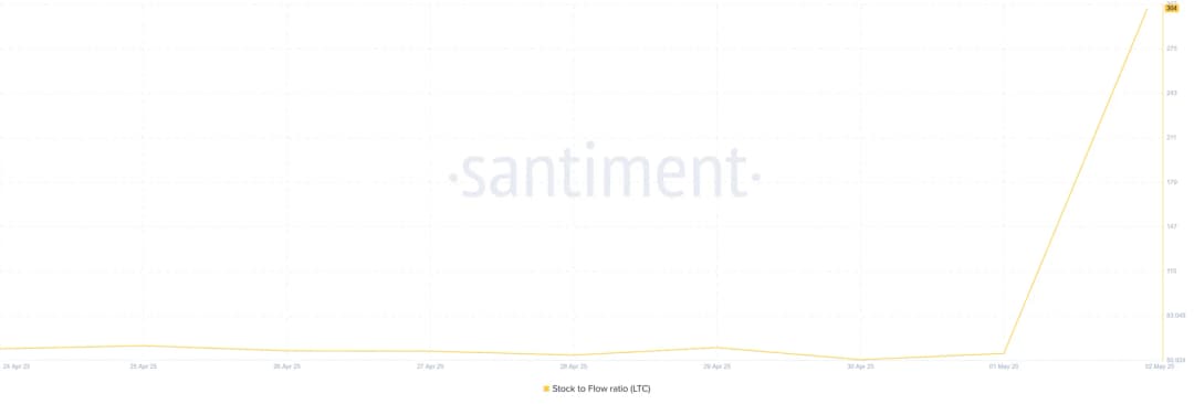 شاخص «مخزون به جریان» لایتکوین در یک روز گذشته به ۳۰۶ جهش کرده است. این افزایش حاکی از کمیابتر شدن توکن و کاهش میزان موجود برای فروش فوری است. معمولاً ترکیب کمیابی بالاتر با تقاضای ثابت یا رو به افزایش به رشد قیمتها منجر میشود.