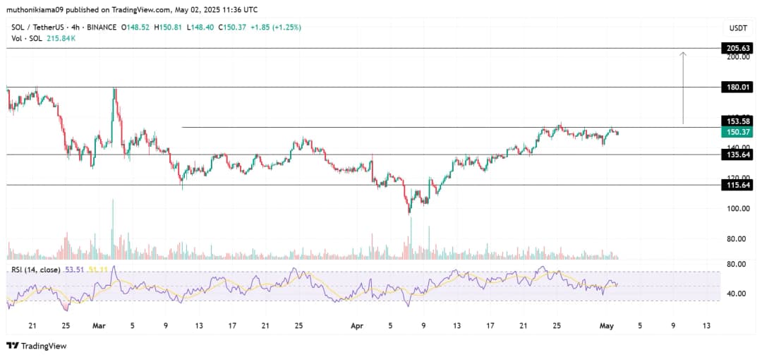 نمودار چهار ساعته سولانا نشان میدهد این آلتکوین در صورت عبور از مقاومتهای حیاتی ۱۵۳ و ۱۸۰ دلار چشمانداز یک شکست صعودی را دارد. در صورت عبور از این سطوح، SOL میتواند تا ۲۰۵ دلار افزایش یابد و روند صعودی تا ۳۰۰ دلار را کلید بزند.