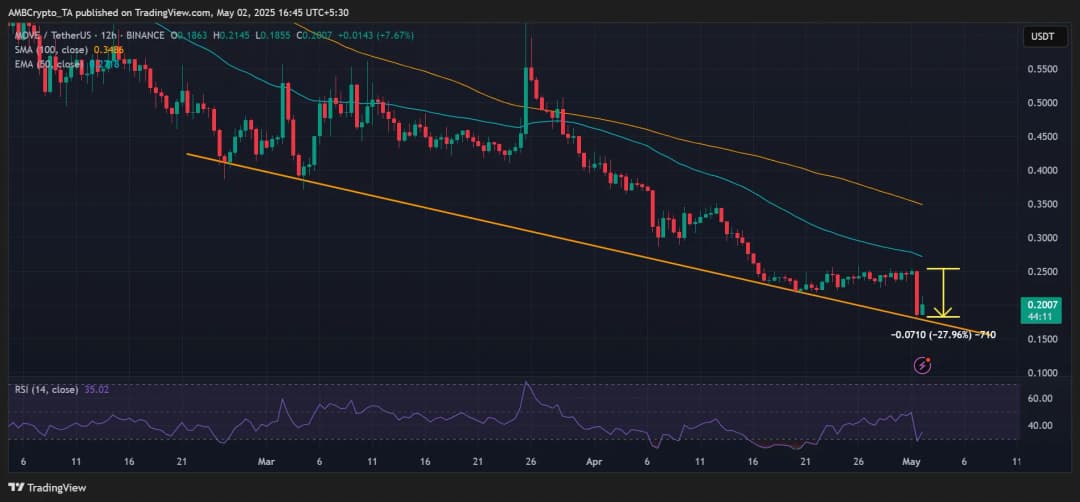 Coinbase همچنین اعلام کرد که معاملات توکن MOVE را از ۱۵ مه متوقف خواهد کرد. این خبر در جلسه معاملات اول مه باعث سقوط ۲۷٪ قیمت شد. بهطور کلی، قیمت توکن از سقف تاریخی ۱٫۴ دلار تا زیر ۰٫۲۰ دلار، ۸۶٪ افت داشته است.
