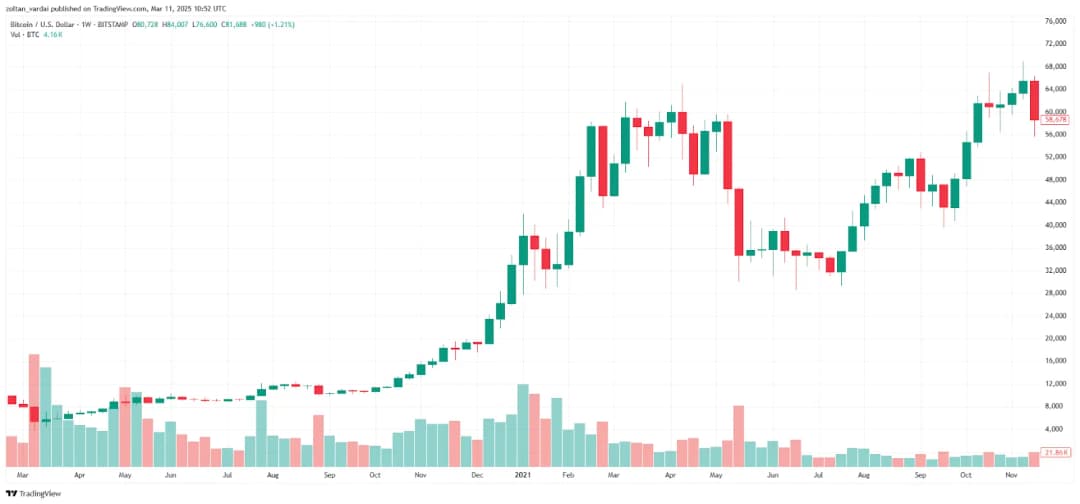 پس از سقوط ناشی از همهگیری کرونا در مارس ۲۰۲۰، بیت کوین بیش از ۱۰۵۰٪ رشد کرد و از ۶۰۰۰ دلار به رکورد تاریخی ۶۹۰۰۰ دلار در نوامبر ۲۰۲۱ رسید. این موج صعودی پس از آن رخ داد که فدرال رزرو در مارس ۲۰۲۰ برنامه خرید دارایی به ارزش ۴ تریلیون دلار را آغاز کرد.