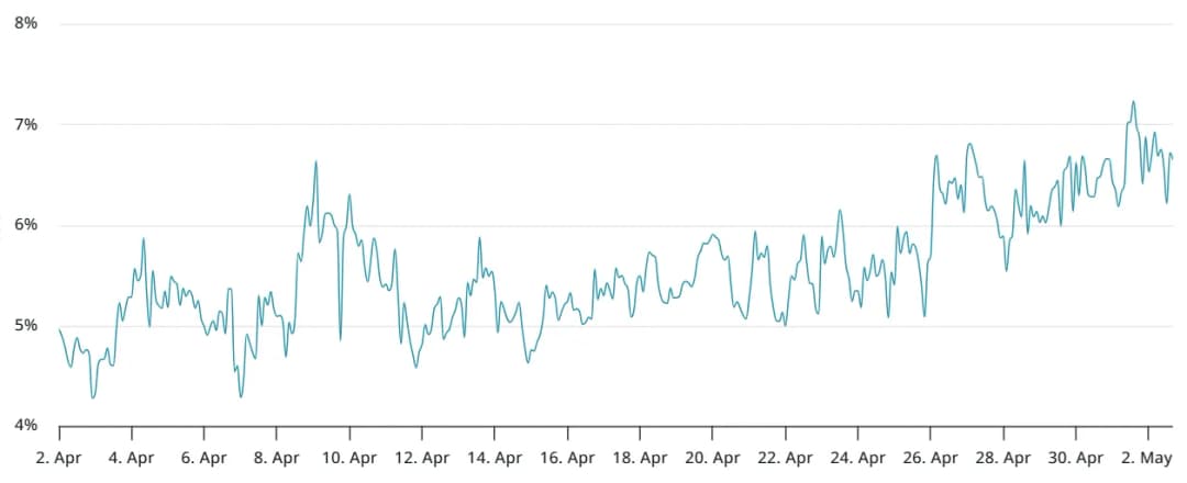 پریمیوم سالانه آتی دوماهه بیت کوین در هفته گذشته بین ۶٪ تا ۷٪ باقی مانده و در بازه خنثی ۵٪ تا ۱۰٪ قرار دارد. در مقایسه با ژانویه، زمانی که پریمیوم آتی بالای ۱۰٪ بود و بیت کوین حوالی ۹۵٬۰۰۰ دلار معامله میشد، احساسات معاملهگران ضعیفتر شده است. این داده نشان میدهد خوشبینی یا حداقل اعتماد به رشد بیشتر قیمت به سمت ۱۰۰٬۰۰۰ دلار کاهش یافته است.