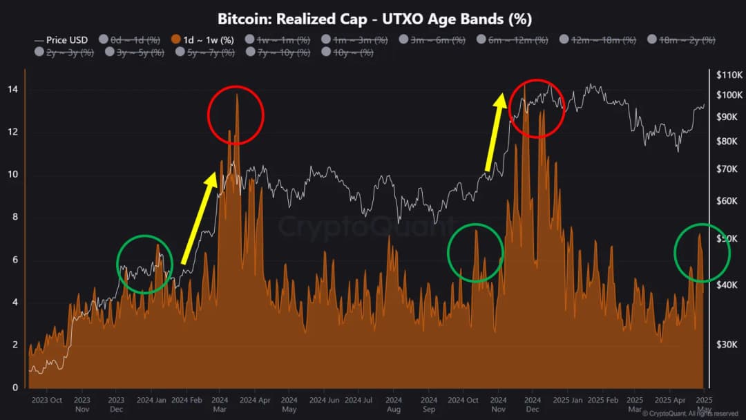نکته جالب آن است که شاخصهای زنجیرهای بیشتر نشان میدادند که رسیدن به ۱۰۰ هزار دلار در دسترس است. بهویژه CryptoQuant تأکید کرد که روند انباشت دارندگان کوتاهمدت (۱ روز تا ۱ هفته) در سهماهه دوم ۲۰۲۵ مشابه الگوهایی بود که در اوایل و اواخر ۲۰۲۴ باعث جهش قیمت شدند.