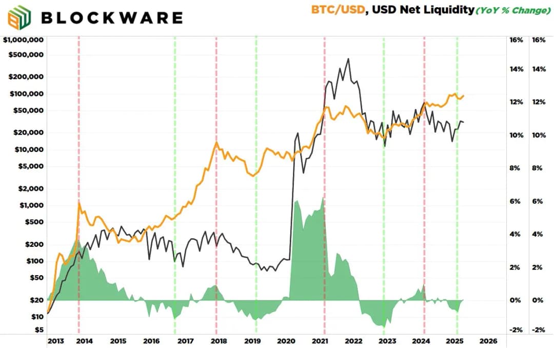 نقدینگی در اواخر ۲۰۲۴ و اوایل ۲۰۲۵ انقباض پیدا کرد، اما در سهماهه دوم ۲۰۲۵ بازگشت. اگر این روند نقدینگی ادامه یابد، میتواند تقاضا برای BTC را افزایش داده و مومنتوم صعودی بیشتری ایجاد کند.