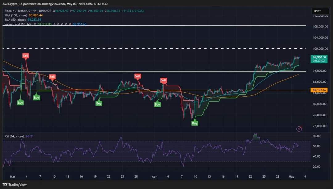 در مجموع، شاخصهای زنجیرهای و تکنیکال از قدرت صعودی حمایت میکنند و احتمال رالی به ۱۰۰ هزار دلار در کوتاهمدت بالا به نظر میرسد.