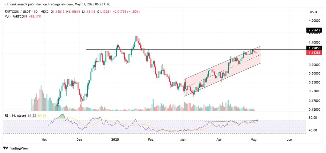 دیگر آلتکوینی که باید خرید آن را در نظر داشت، فارتکوین است که در حال حاضر از بهترین عملکردها را در میان میمکوینها دارد. این توکن در داخل یک کانال صعودی موازی معامله میشود که نشاندهنده وجود مومنتوم صعودی است. این قدرت صعودی توسط افزایش شاخص RSI تأیید میشود و اگر فارتکوین بتواند مقاومت ۱٫۲۹ دلار را بشکند، قیمت آن ممکن است تا ۲٫۷۵ دلار از حالت سهمی شکل رشد کند.