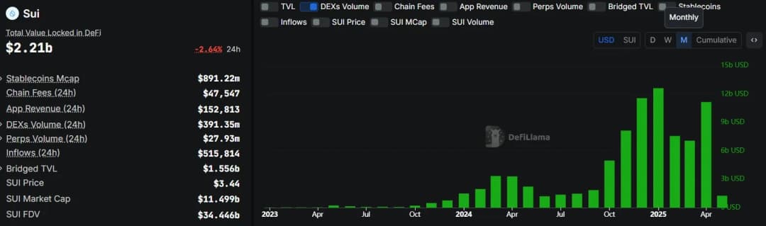 SUI اخیراً به دلیل افزایش فعالیت در بلاکچین، به یکی از آلتکوینهای پرطرفدار تبدیل شده است. دادههای DeFiLlama نشان میدهد ماه گذشته حجم معاملات DEX این شبکه ۴ میلیارد دلار افزایش یافته که باعث رشد بیش از ۴۵٪ قیمت آن شد. اگر این معیار این ماه هم با هجوم معاملهگران به خاطر تعرفه ادامه یابد، احتمال ثبت سودهای بیشتر وجود دارد.