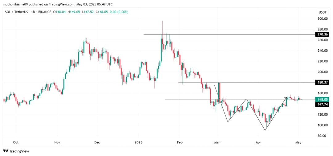 قیمت سولانا امروز ۱۴۸ دلار است و در ۲۴ ساعت گذشته ۱٫۲۱٪ کاهش داشته است. یکی از دلایل قرارگیری آن در فهرست آلتکوینهای برتر برای خرید، مقاومت آن در سال ۲۰۲۵ است با وجود نگرانیهای کلان اقتصادی. علاوه بر این، نمودار روزانه SOL الگوی W ساخته است که در صورت حفظ حمایت ۱۴۸ دلاری، از چشمانداز صعودی سولانا حکایت دارد. اگر SOL بتواند بالای ۱۵۰ دلار تثبیت شود، مقاومت بعدی ۱۸۰ دلار است و در ادامه ممکن است تا ۲۷۰ دلار رشد کند.