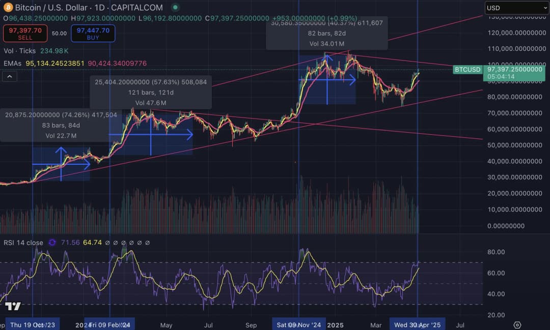یک نکته جالب در نمودار روزانه قیمت بیت کوین، روندهای صعودی طولانیمدت پس از عبور شاخص قدرت نسبی یکروزه (RSI) از سطح ۷۰ است. در این موارد، بهطور تاریخی قیمت ۴۰٪ تا ۷۰٪ در ۳۰ تا ۴۰ روز بعد افزایش یافته است.