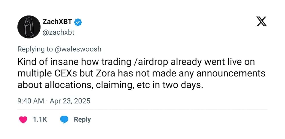 توکن ZORA در تاریخ ۲۳ آوریل عرضه شد، اما تا دو ساعت پس از شروع معاملات، از این عرضه رسمی خبری نبود. همین موضوع در شبکههای اجتماعی ایجاد سردرگمی کرد.