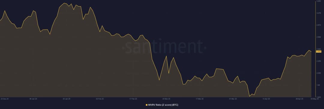 سودآوری با MVRV Z-score به ۲.۴۲ رسیده که جهش چشمگیری از کفهای ماه مارس محسوب میشود. این سطح نشان میدهد دارندگان در حال کسب سود هستند اما هنوز به محدوده خطرناک اوج تاریخی نرسیدهاند. بنابراین فشار فروش از سوی سودگیرهای افراطی کم است و همزمان اعتماد به رشد بیشتر قیمت افزایش یافته است. این شاخص بیانگر تعادل بازار است که امکان رشد قیمت بدون تحریک فروش گسترده را فراهم میکند.