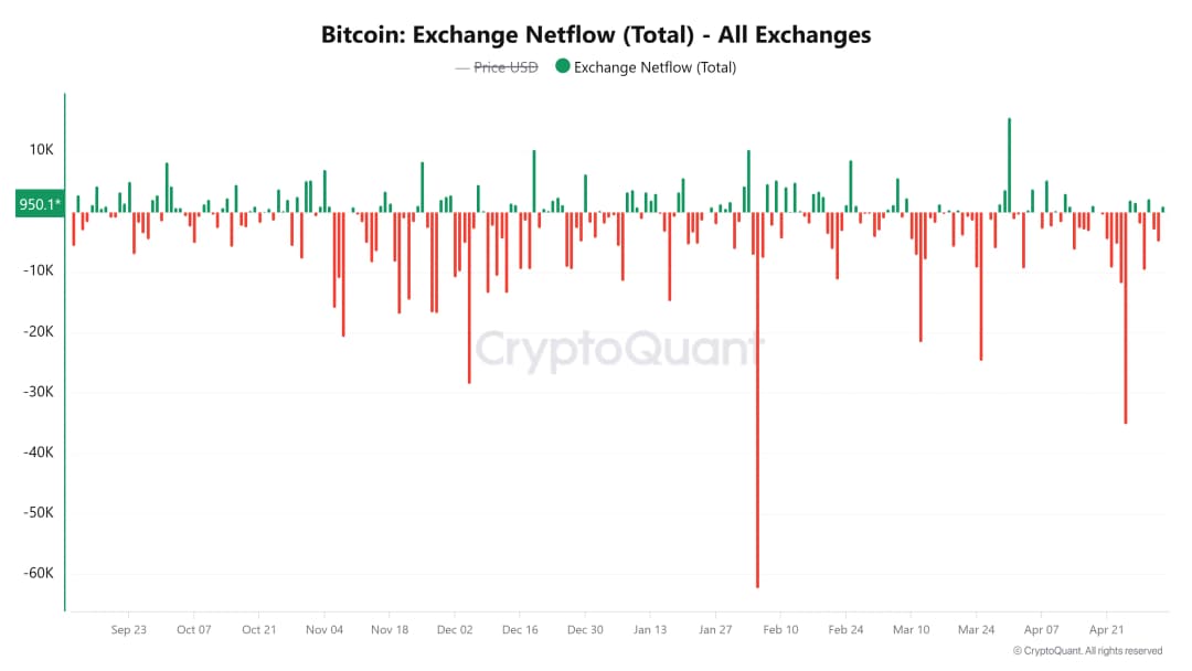 در زمان نگارش این خبر، قیمت بیت کوین برابر با ۹۶,۳۹۸.۳۳ دلار بود که نسبت به ۲۴ ساعت گذشته ۰.۳۶٪ افت نشان میدهد. موجودی بیت کوین در صرافیها به ۲۳۸.۳۱ میلیارد دلار کاهش یافته که ۰.۶۷٪ کمتر است. این افت نشان میدهد معاملهگران بیشتر در حال انتقال BTC از صرافیها به کیفپولهای شخصی هستند؛ سیگنالی صعودی به دلیل کاهش عرضه برای فروش. جریان خالص (netflow) نیز منفی ۴٫۳۳ هزار BTC بوده که ۲.۴۵٪ به سمت خروج سرمایهها جابهجا شده است. این تغییرات بیانگر افزایش رفتار انباشت است که فضای مناسبی برای ثبات قیمت و پتانسیل رشد فراهم میکند.