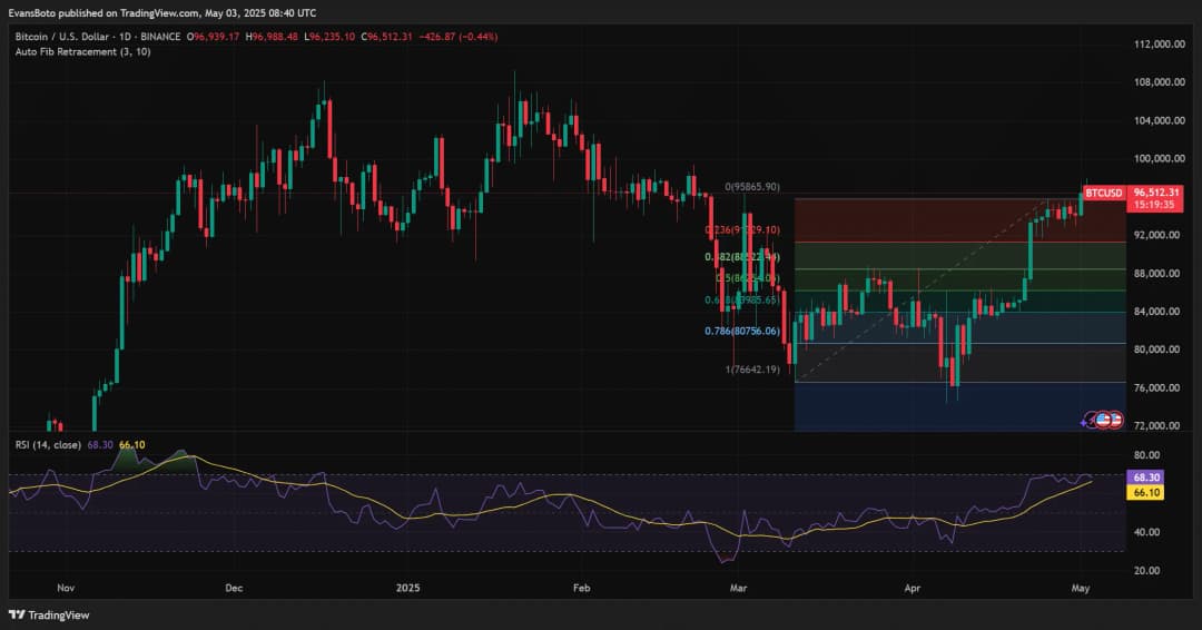 بیت کوین حالا در نزدیکی مقاومت ۹۶.۵ هزار دلار قرار دارد که با ناحیه بازگشتی فیبوناچی ۰.۲۳۶ همراستا است. ساختار قیمتی نشان میدهد مومنتوم صعودی حفظ شده و روند صعودی از کفهای مارس ادامه دارد. شاخص RSI روی ۶۸.۳۰ قرار دارد—نزدیک به منطقه اشباع خرید اما هنوز داغ نشده. اگر BTC بتواند محدوده ۹۶.۵–۹۷ هزار دلار را به حمایت تبدیل کند، احتمال شکست به سمت سقفهای قبلی و هدف ۱۰۰ هزار دلار افزایش مییابد. در غیر این صورت ممکن است پیش از حرکت بزرگ بعدی، کمی نوسان و تثبیت شاهد باشیم.