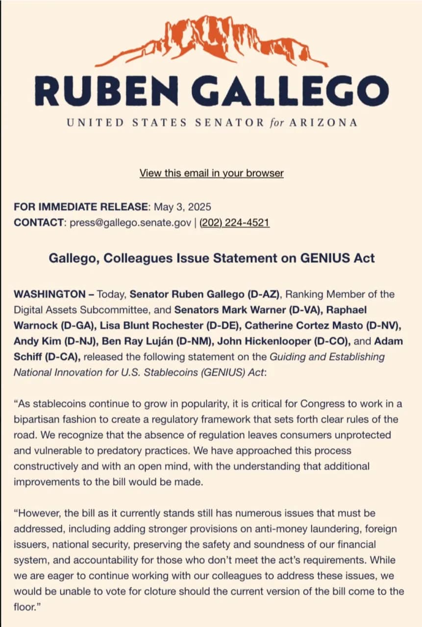 گروهی از سناتورهای دموکرات ایالات متحده که سابقه حمایت از صنعت رمزارز را دارند اعلام کردند در صورت حرکت طرح استیبلکوین جمهوریخواهان در شکل فعلی، با آن مخالف خواهند بود.