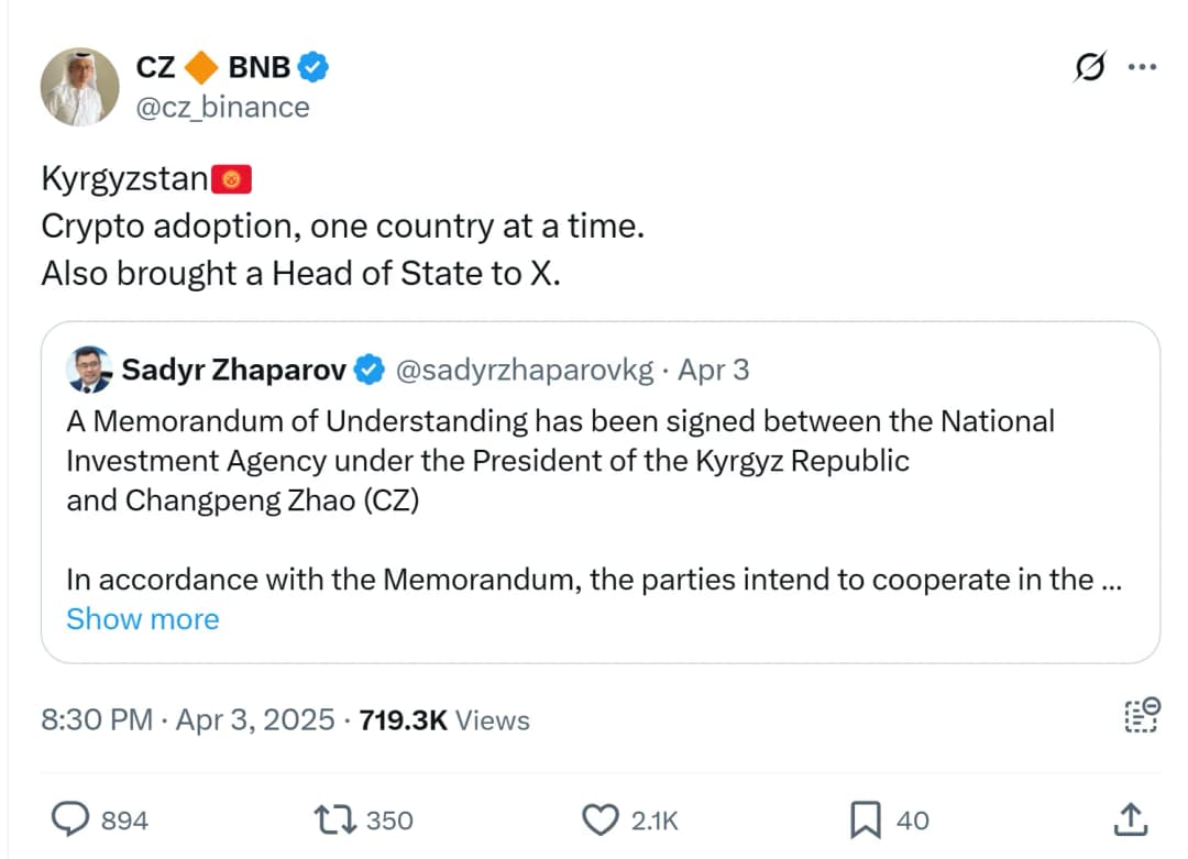 در تاریخ ۴ آوریل، چانگپنگ «CZ» ژائو، مدیرعامل سابق بایننس، پس از امضای یادداشت تفاهم با آژانس سرمایهگذاری خارجی قرقیزستان، اعلام کرد که آغاز به مشاوره درباره قوانین مرتبط با بلاکچین و رمزارز در این کشور خواهد کرد.