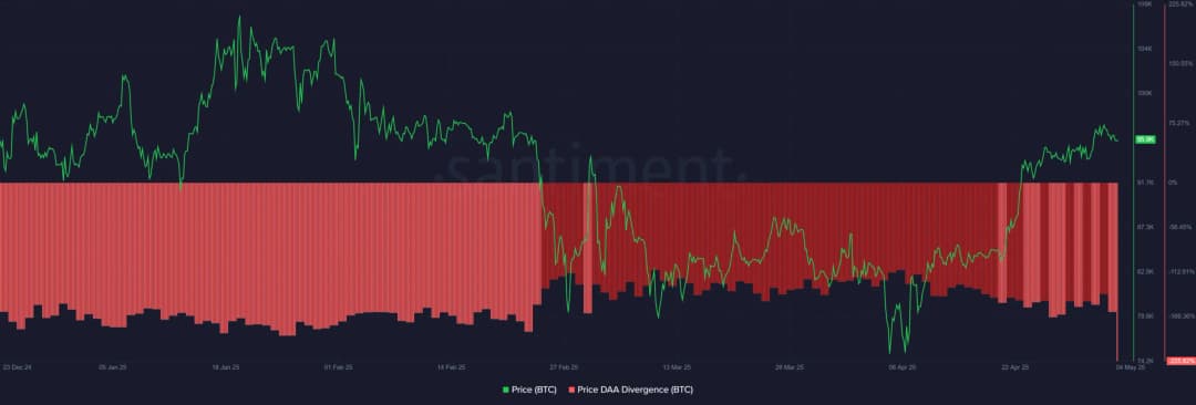 دادههای Glassnode همچنین افزایش چشمگیری در استفاده زنجیرهای نشان دادند؛ به طوری که در ۲۴ ساعت گذشته ۹۲۵,۹۱۴ آدرس فعال ثبت شده است. این بالاترین سطح فعالیت شبکه در شش ماه اخیر را نشان میدهد و نشانه تعامل قوی با بلاکچین است. با این حال، ممکن است هیجان بیش از حد باشد. انحراف Price DAA در Santiment برابر با ۲۲۵.۸۲-٪ بود که نشان میدهد قیمت از رشد طبیعی تعداد آدرسها پیشی گرفته است.