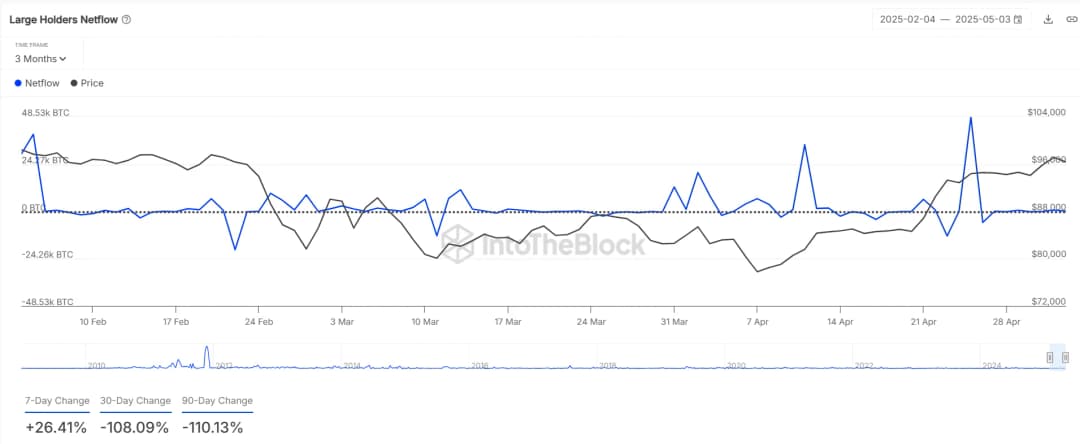تجمع تازه نهنگها اولین جرقه خوشبینی را فراهم کرد. خالص جریان دارایی دارندگان بزرگ طی هفته گذشته ۲۶.۴۱٪ افزایش یافته و نشاندهنده اطمینان کوتاهمدت در سطوح کنونی است. با این حال، روند کلی همچنان تحت فشار خالص جریانهای ۳۰ روزه و ۹۰ روزه قرار دارد که به ترتیب ۱۰۸.۰۹-٪ و ۱۱۰.۱۳-٪ کاهش یافتهاند. بنابراین، علیرغم بهبود اخیر، توزیع بلندمدت همچنان چالشی برای حفظ شتاب صعودی باقی میگذارد.