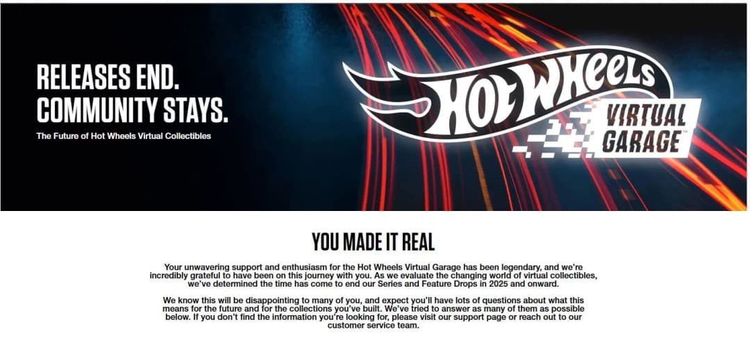شرکت بزرگ تولید اسباببازی متل تصمیم گرفته تا عرضه توکنهای غیرقابل معاوضه گاراژ مجازی Hot Wheels را موقتا متوقف کند و منتظر تصمیمگیری در مورد آینده این مجموعه باشد. بر اساس اطلاعیه وبسایت متل، “در آینده نزدیک هیچ سری جدید یا ویژگی تازهای منتشر نخواهد شد.” شرکت اعلام کرد که درباره “آینده بلندمدت” مجموعههای دیجیتال خود تصمیم میگیرد.