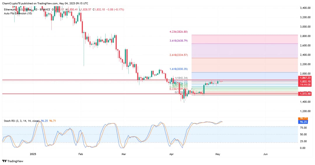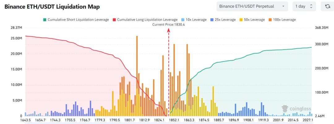 منبع: Coinglass ساختار قیمتی اتریوم در محدوده ۱۷۷۰ دلار (حمایت) تا ۱۸۶۷ دلار (مقاومت) قرار دارد. سطح ۱۸۶۷ دلار در تلاشهای اخیر برای صعود به عنوان سقف عمل کرده است. عبور قاطعانه از آن میتواند هدف اکستنشن فیبوناچی ۱.۶۱۸ را در ۲۰۳۰ دلار آزاد کند. با این حال، شاخص RSI استوکاستیک در حدود ۹۶ قرار دارد که شرایط اشباع خرید را نشان میدهد. با این وجود، ساختار کلی با کفهای بالاتر و مقاومت افقی یک الگوی کلاسیک شکست را ایجاد کرده است که معاملهگران به دقت آن را زیر نظر دارند.