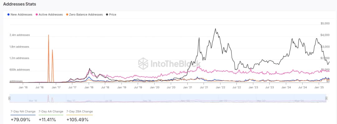اصول بنیادین شبکه اتریوم نشانگر افزایش تعاملات درون زنجیرهای است. تعداد آدرسهای جدید در هفت روز اخیر ۷۹.۰۹٪ افزایش یافته و آدرسهای فعال ۱۱.۴۱٪ رشد کردهاند. علاوه بر این، آدرسهای با مانده صفر تا ۱۰۵.۴۹٪ افزایش یافتهاند که احتمالاً نشاندهنده آزمایش کاربران، پاکسازی کیفپولها یا از دست رفتن کلیدها است. این اعداد نشان میدهد با وجود نوسانات اخیر قیمت، پذیرش و گسترش شبکه ادامه دارد. بنابراین، افزایش شاخصهای آدرس میتواند به عنوان یک هشدار دهنده پیشرو از تقاضای آینده عمل کند و تایید کند اکوسیستم گسترده اتریوم از نظر بنیادی سالم و در حال رشد است.