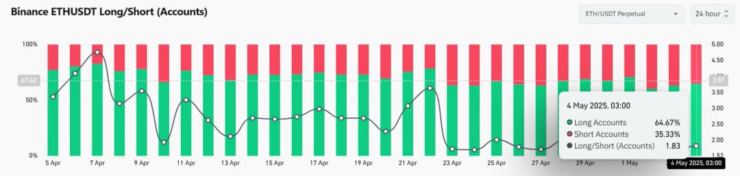 منبع: Coinglass دادههای بایننس نشان میدهد که ۶۴.۶۷٪ معاملهگران در حال حاضر روی ETH موقعیت خرید دارند و نسبت خرید/فروش به ۱.۸۳ رسیده است. این تعصب صعودی مداوم اعتماد معاملهگران را نشان میدهد اما ریسک نوسان شدید در صورت حرکت نامطلوب قیمت را هم افزایش میدهد. در معاملات شلوغ، هر افت غیرمنتظره زیر حمایتهای کلیدی میتواند باعث تسویه موقعیتهای خرید شود. با این حال تا کنون این تعصب با سایر شاخصهای صعودی هماهنگ است و اکثر معاملهگران ادامه روند را به بازگشت ترجیح میدهند.