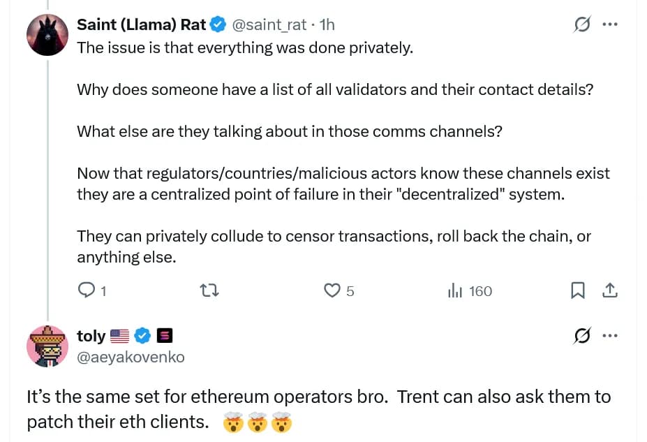 مدیرعامل Solana Labs، Anatoly Yakovenko، ادعاها را مستقیماً رد نکرد اما گفت اعضای جامعه اتریوم هم میتوانند برای رفع یک آسیبپذیری مشابه هماهنگ شوند. او اشاره کرد که بیش از هفتاد درصد اعتباردهندههای شبکه اتریوم نیز تحت کنترل صرافیها یا اپراتورهای استیکینگ مانند Lido هستند.