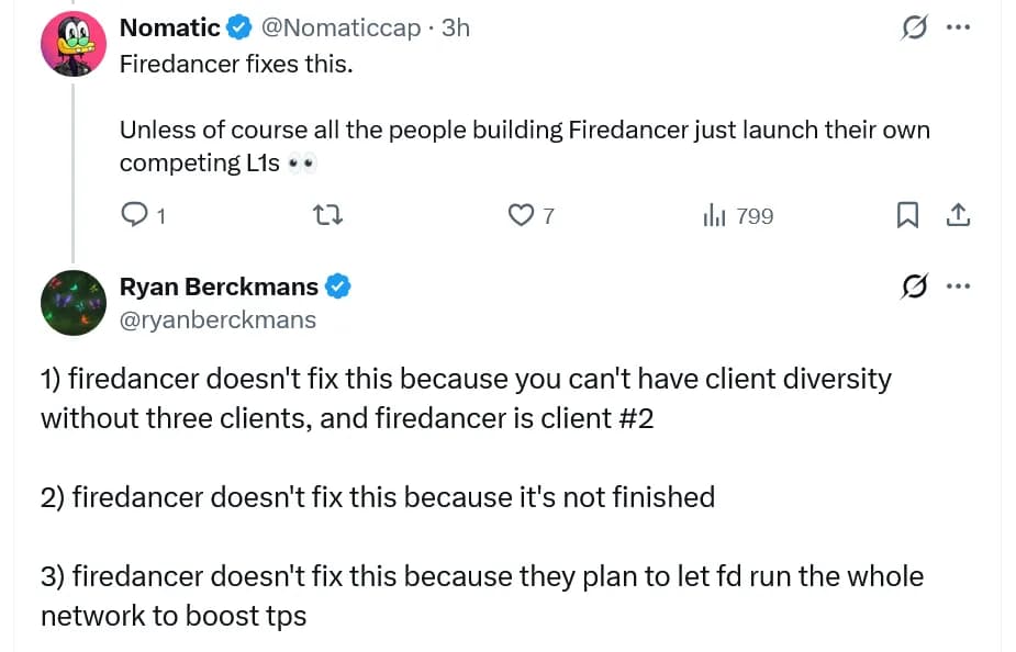 در همین حال، سولانا قصد دارد در ماههای آینده کلاینت جدیدی به نام Firedancer را راهاندازی کند که انتظار میرود مقاومت و زمان فعالیت شبکه را بهبود دهد. اما برکمنز گفت برای تمرکززدایی کافی در سطح کلاینت، سولانا به سه کلاینت نیاز دارد.