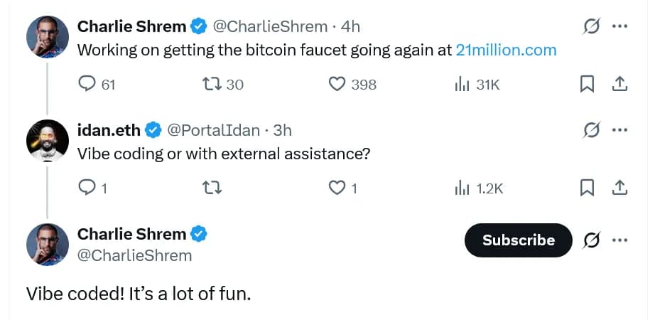 او در پستی در شبکه ایکس در تاریخ ۴ می، وبسایت 21million.com را معرفی کرد که شبیه اولین صفحه کپچای بیت کوین است که گاوین اندرسن در سال ۲۰۱۰ طراحی کرد. این وبسایت در حال حاضر یک تصویر از تسک کپچا و جعبهای برای وارد کردن آدرس بیت کوین نمایش میدهد که در زمان نگارش این مطلب عملیاتی نبود و نشان میدهد ۰ بیت کوین برای ادعا موجود است.
