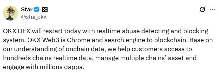 در بیانیه ای که ۴ مه به شبکه X منتشر شد، استار شو، مؤسس و مدیرعامل OKX، گفت که تجمیع کننده DEX با نام OKX Web3 با چند ویژگی جدید از جمله «سیستم تشخیص و مسدودسازی سوء استفاده در زمان واقعی» دوباره راه اندازی می شود.