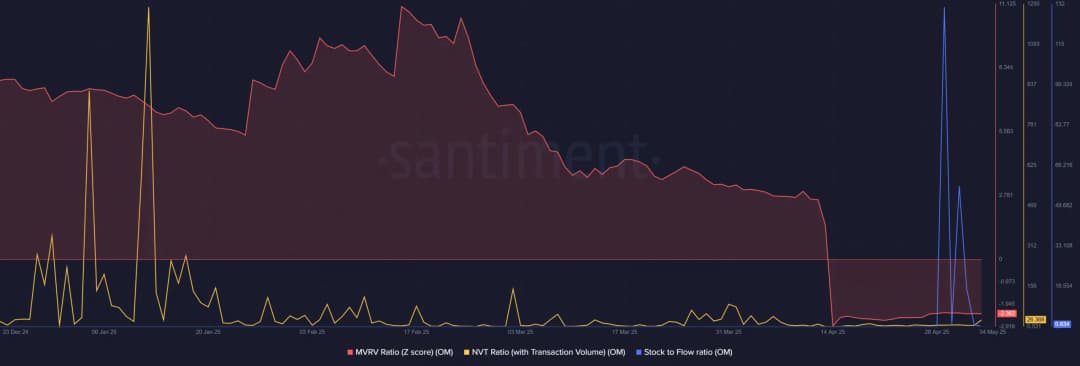 از دیدگاه ارزشگذاری، OM در میانه دو انتهای افراطی قرار دارد. نمره Z در MVRV برابر با ۲.۳۶- بود که نشاندهنده زیانهای تحققنیافته عمیق در سراسر بازار است. بهطور تاریخی، چنین خوانشهایی قبل از رسیدن به کفهای بازار رخ داده، اما تنها زمانی که با تقاضای تازه همراه باشند.