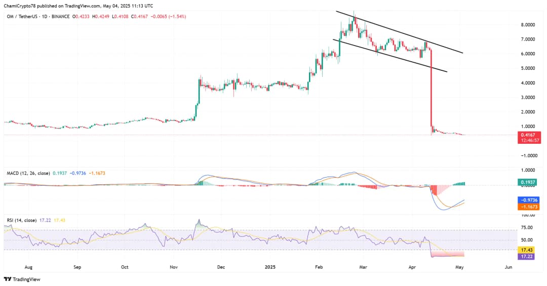 عملکرد قیمتی OM تصویر فنی تاریکی را ترسیم میکند. در زمان نگارش، مانترا با قیمت ۰.۴۱۵۲ دلار معامله میشد که در ۲۴ ساعت گذشته ۴.۹۳ درصد کاهش یافته است. این توکن اخیراً از ساختار کانال نزولی خارج شد و سقوط آن از بالای ۶ دلار به زیر ۰.۵۰ دلار را تسریع کرد.