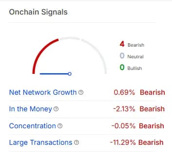از سوی دیگر، اصول بنیادین نیز به نفع مانترا نبودند. دادههای IntoTheBlock نشان میدهد چهار معیار اصلی—رشد خالص شبکه، آدرسهای در سود، تمرکز نهنگها و تراکنشهای بزرگ—همگی سیگنالهای نزولی ارسال کردهاند.
