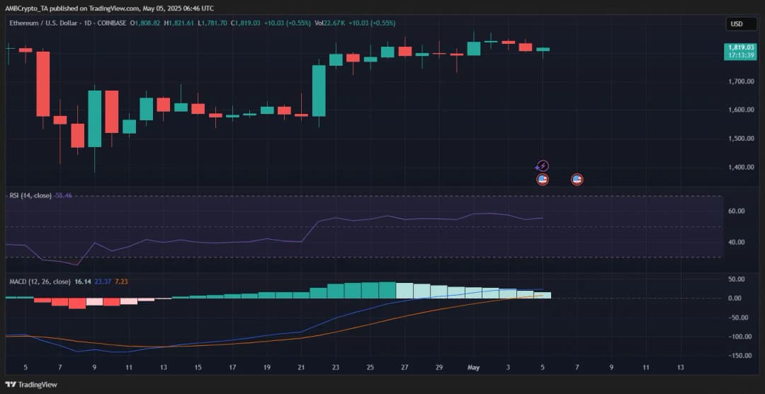در زمان نگارش این گزارش، ETH با قیمت ۱,۸۱۹ دلار بالای حمایت کلیدی ۱,۸۰۰ دلار معامله میشد و تمایل خفیف صعودی داشت.