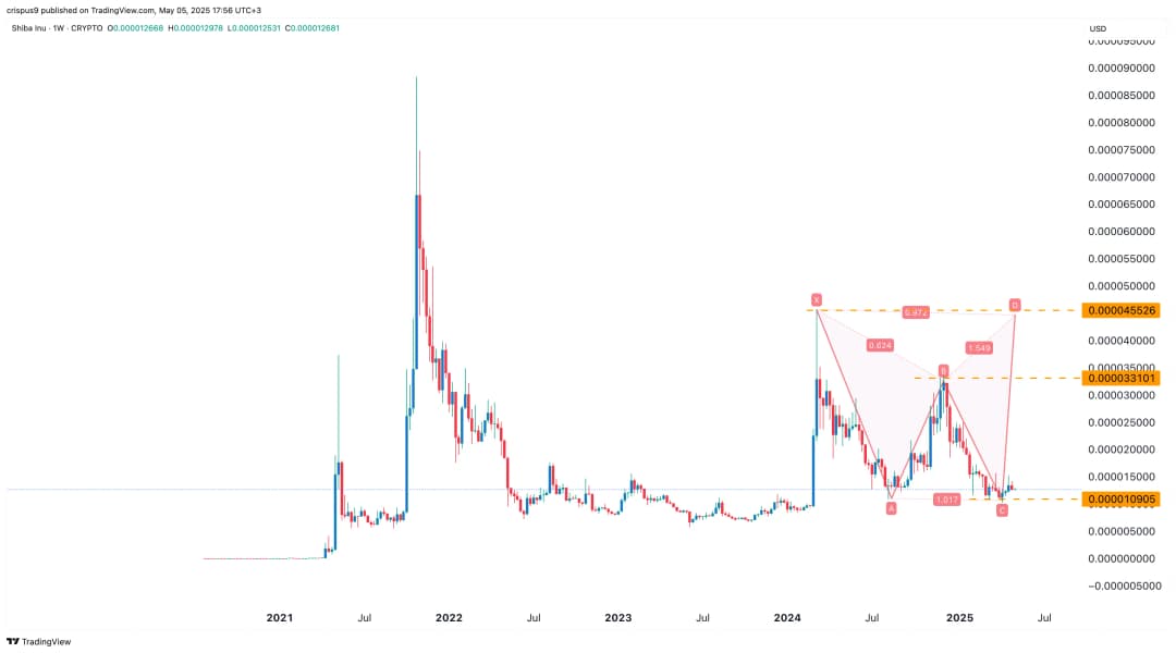 حرکت XA بین مارس و آگوست سال گذشته رخ داد و حرکت AB در دسامبر شکل گرفت. قیمت اکنون به نقطه C در ۰.۰۰۰۰۱۰ دلار رسیده است. اگر این الگو به درستی عمل کند، بخش CD آن را تا اوج ۲۰۲۴ یعنی ۰.۰۰۰۰۴۵۵۲ دلار سوق میدهد.