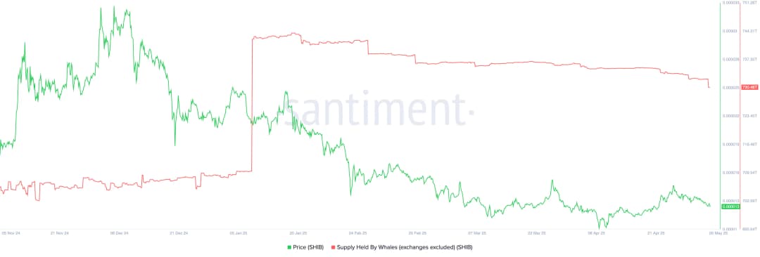 قیمت شیبا اینو امسال ۴۱.۷۵٪ کاهش یافته است، که مشابه عملکرد سایر میمکوینهای سنتی مانند دوج کوین و پپه است. این ریزش همزمان با فروش مداوم نهنگها بوده که از ژانویه تاکنون بیش از ۱۳ تریلیون توکن فروختهاند.