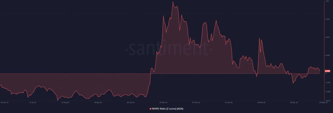 شاخص MVRV Z-score کاردانو از دادههای Santiment در زمان انتشار برابر با ۰٫۰۵۶ بود. این رقم نشان میدهد که دارایی نسبت به میانگین تاریخی خود هنوز کمارزش است و فشار فروش ناشی از سودگیری اندک است. معمولاً سطوح MVRV بالای ۱ نشانه شرایط پر سود است که در معرض اصلاح قرار دارد، اما وضعیت کنونی ADA تا حد زیادی خنثی است.