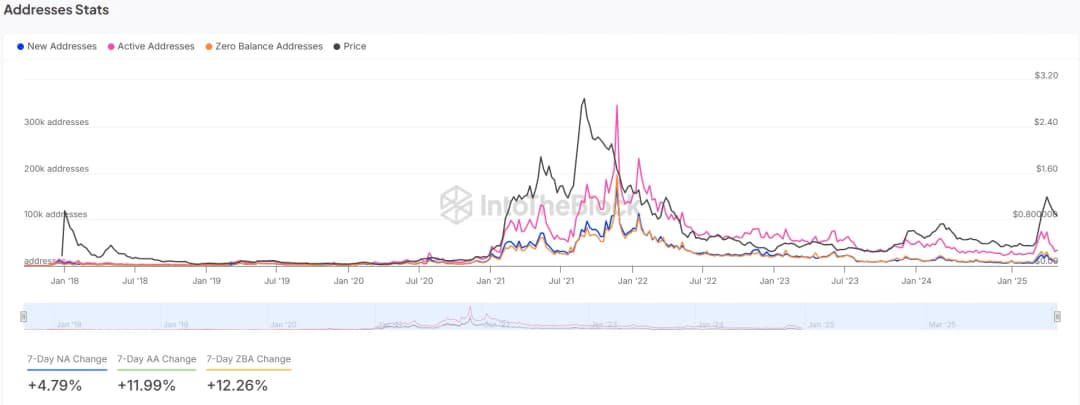 دادههای آنچین نشان داد که در هفته گذشته آدرسهای جدید ۴٫۷۹ درصد، آدرسهای فعال ۱۱٫۹۹ درصد و آدرسهای بدون موجودی ۱۲٫۲۶ درصد افزایش یافتهاند. این روندها حکایت از رشد مشارکت کاربران و علاقه سفتهبازانه دارد. بهطور معمول، افزایش فعالیت آدرسها با احساسات قوی اجتماعی ترکیب میشود و از رشد بلندمدت قیمت پشتیبانی میکند.