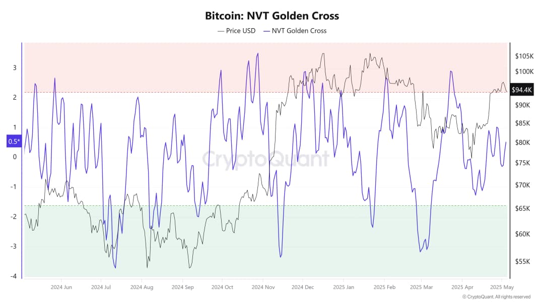 بهطور مشابه، نسبت ارزش شبکه به تراکنشها (NVT) با قیمت بیت کوین ۹۴٬۴۰۰ دلار در سطح خنثی ۰.۵ قرار دارد، در حالی که هنگام قرارگیری BTC در این سطح در فوریه ۲۰۲۵ سیگنال اشباع خرید صادر شده بود. این تغییر در پویایی بازار و تکامل رفتار دارندگان نشان میدهد که گروه فعلی سرمایهگذاران دارای سود ممکن است کمتر مایل به فروش در این سطوح باشند. این موضوع میتواند به تقویت بیشتر چشمانداز صعودی ساختار فعلی بازار کمک کند.