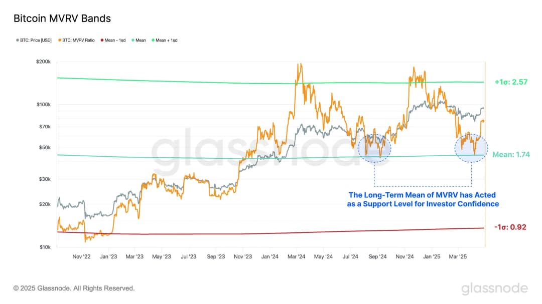 گلسنود همچنین اشاره کرد که نسبت ارزش بازار به ارزش تحققیافته (MVRV)، شاخص مهم احساسات بازار، به میانگین بلندمدت ۱.۷۴ بازگشته است. از ژانویه ۲۰۲۴، این سطح بهعنوان یک ناحیه حمایتی در فازهای تثبیت عمل کرده، کاهش سودهای تحققنیافته را نشان داده و پایهای برای رشد آتی فراهم میکند.