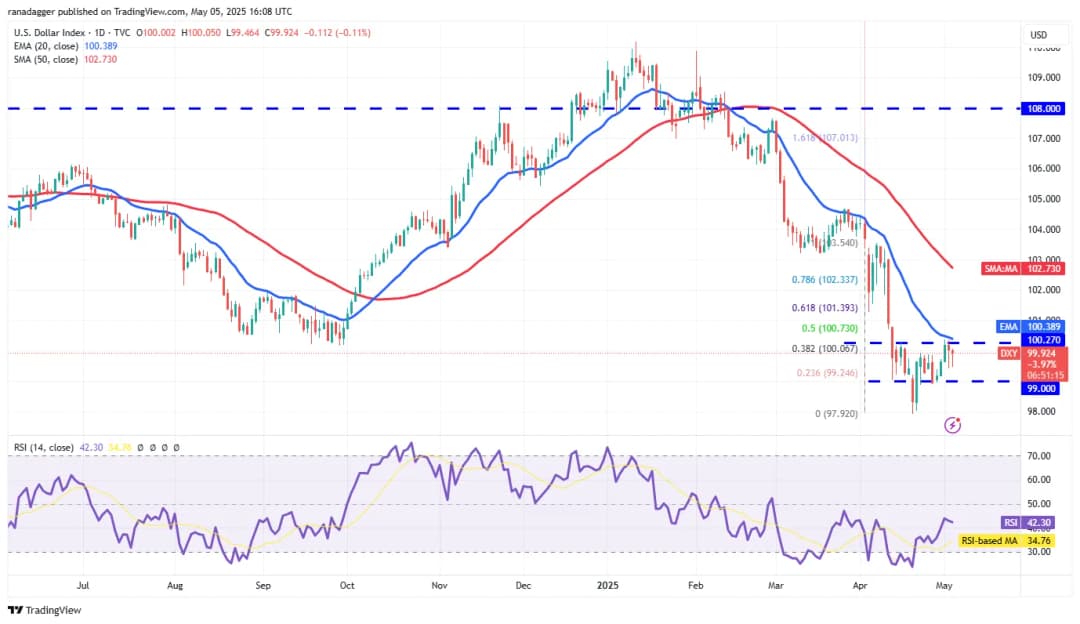 شاخص دلار آمریکا (DXY) در تاریخ ۲۹ آوریل از حمایت ۹۹ برگشت زد و به میانگین متحرک نمایی ۲۰ روزه (۱۰۰.۳۸) در اول مه رسید.