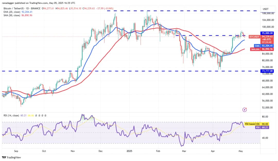 بیت کوین (BTC) در تاریخ ۴ مه زیر سطح شکست ۹۵٬۰۰۰ دلار سقوط کرد که نشاندهنده ثبت سود در سطوح بالا است. گاوها در ۵ مه تلاش کردند قیمت را دوباره بالای ۹۵٬۰۰۰ دلار ببرند، اما با مقاومت سخت خرسها مواجه شدند.