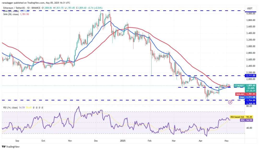 میانگین متحرک نمایی ۲۰ روزه (۱٬۷۷۱ دلار) بهتدریج در حال صعود است و شاخص قدرت نسبی در ناحیه مثبت قرار دارد که نشان میدهد راه کم مقاومت به سمت بالاست. مقاومت جزئی در ۱٬۹۵۷ دلار وجود دارد اما احتمال عبور از آن بالاست. جفت ETH/USDT میتواند تا سطح شکست ۲٬۱۱۱ دلار صعود کند، جایی که خرسها انتظار فروش شدید دارند. شکست و بسته شدن زیر میانگینهای متحرک درهای سقوط به ۱٬۵۳۷ و سپس حمایت حیاتی ۱٬۳۶۸ دلار را باز میکند.
