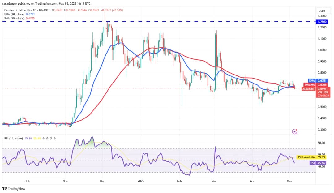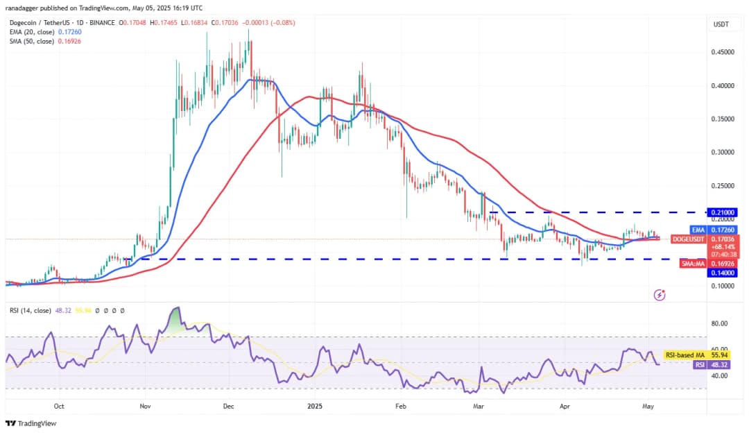 میانگینهای متحرک تقریباً تخت و RSI نزدیک به میانه است که نشان میدهد DOGE/USDT ممکن است برای مدتی در محدوده ۰.۱۴ تا ۰.۲۱ دلار نوسان کند. اگر قیمت از میانگینهای متحرک بازگردد، گاوها تلاش خواهند کرد جفت را تا ۰.۲۱ دلار برسانند. فروشندگان این سطح را به شدت دفاع خواهند کرد، اما در صورت پیروزی خریداران، قیمت میتواند تا ۰.۲۸ دلار جهش کند. برعکس، شکست زیر میانگینهای متحرک میتواند قیمت را به حمایت قوی ۰.۱۴ دلار بکشاند.