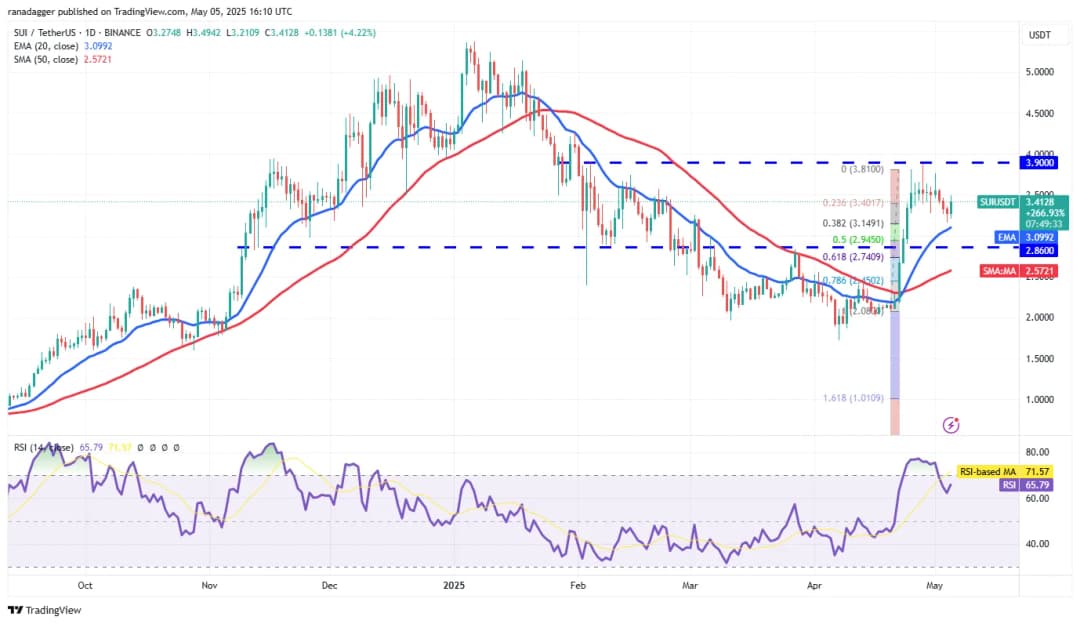 گاوها تلاش میکنند قیمت را تا ۳.۹۰ دلار بالا ببرند که انتظار میرود مقاومت سنگینی ایجاد کند. با این حال، میانگین متحرک نمایی ۲۰ روزه صعودی و RSI در ناحیه مثبت نشان میدهد خریداران برتری دارند. شکست و بسته شدن بالای ۳.۹۰ دلار میتواند SUI/USDT را تا ۴.۲۵ دلار و سپس ۵ دلار پرتاب کند. در مقابل، بازگشت از سطح فعلی یا مقاومت بالاسری و بسته شدن زیر ۲۰ روزه EMA نشان میدهد گاوها تسلیم شدهاند و قیمت ممکن است تا ۲.۸۶ دلار و سپس میانگین متحرک ساده ۵۰ روزه (۲.۵۷ دلار) کاهش یابد.