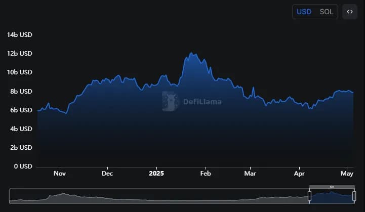 در زمان نگارش، TVL از سقف ۸.۰۳۹ میلیارد دلار در ماه مه به ۷.۸۲۵ میلیارد دلار سقوط کرده و به معنای آزادسازی و ورود ۲۱۴ میلیون دلار SOL به بازار است. این حجم بزرگ عرضه، فشار نزولی روی قیمت SOL را افزایش میدهد.